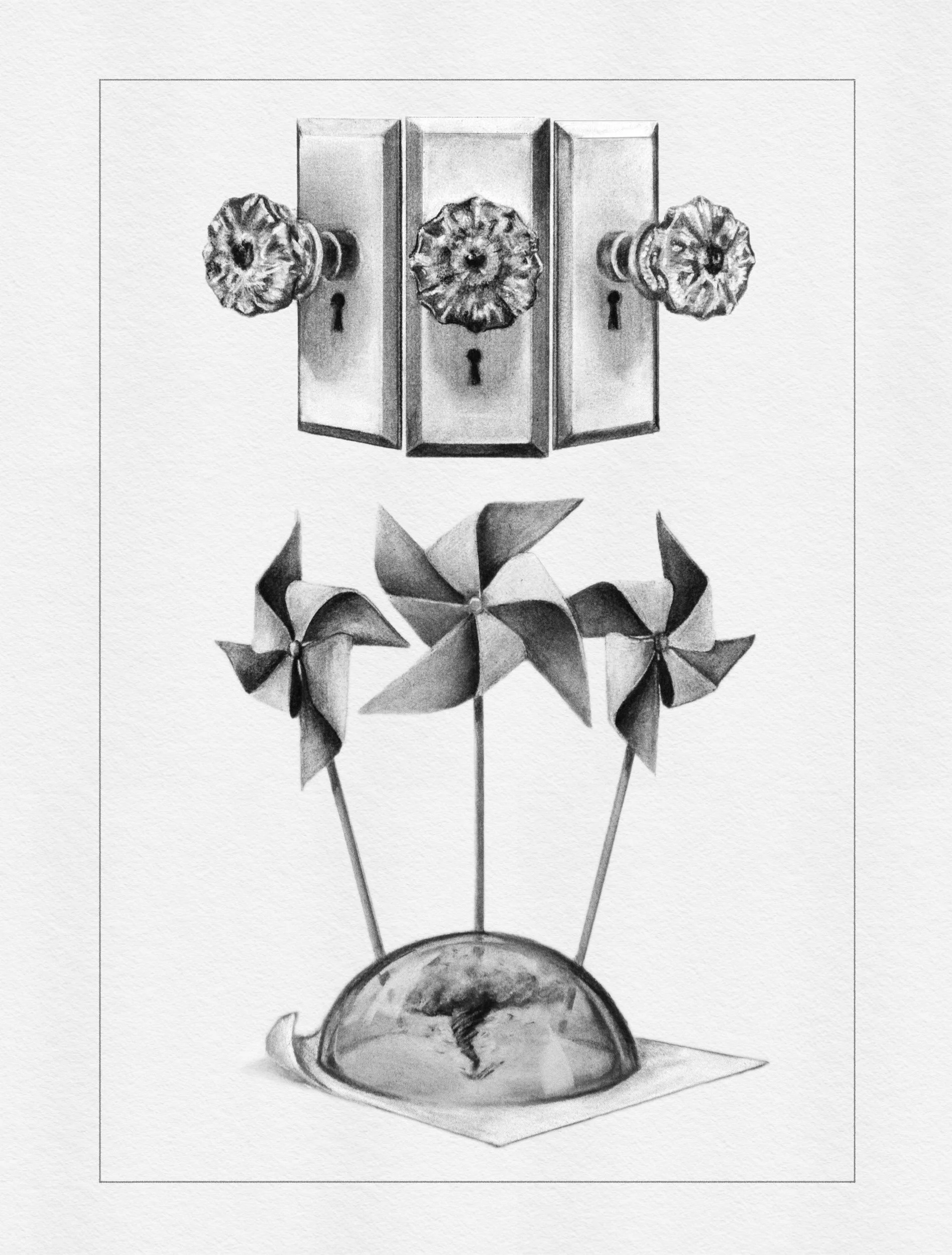 How Else Can I Tell You is a new series of drawings striving to create a new language for connecting and communicating. Comprised of recognizable parts arranged in strange new combinations, each object is gathered, stacked, and compressed to tell the story of what it is to bear witness—to time, to trauma, to power lost and gained, to the paradoxes of protection, to the resilience inherent in what remains.
